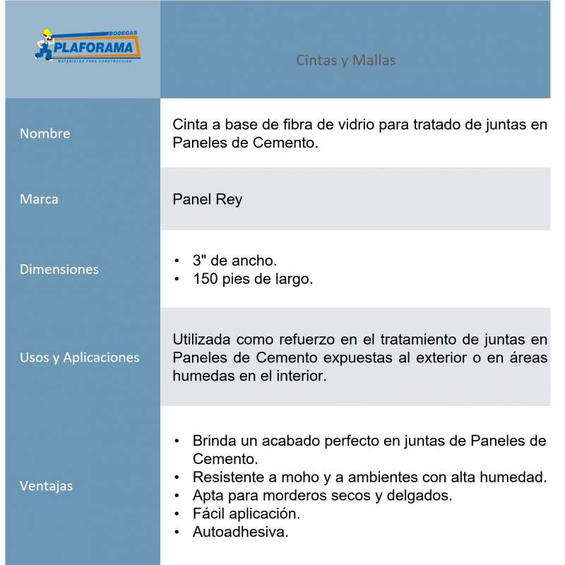 Utilizada como refuerzo en el tratamiento de juntas en Paneles de Cemento expuestas al exterior o en áreas humedad en el interior.