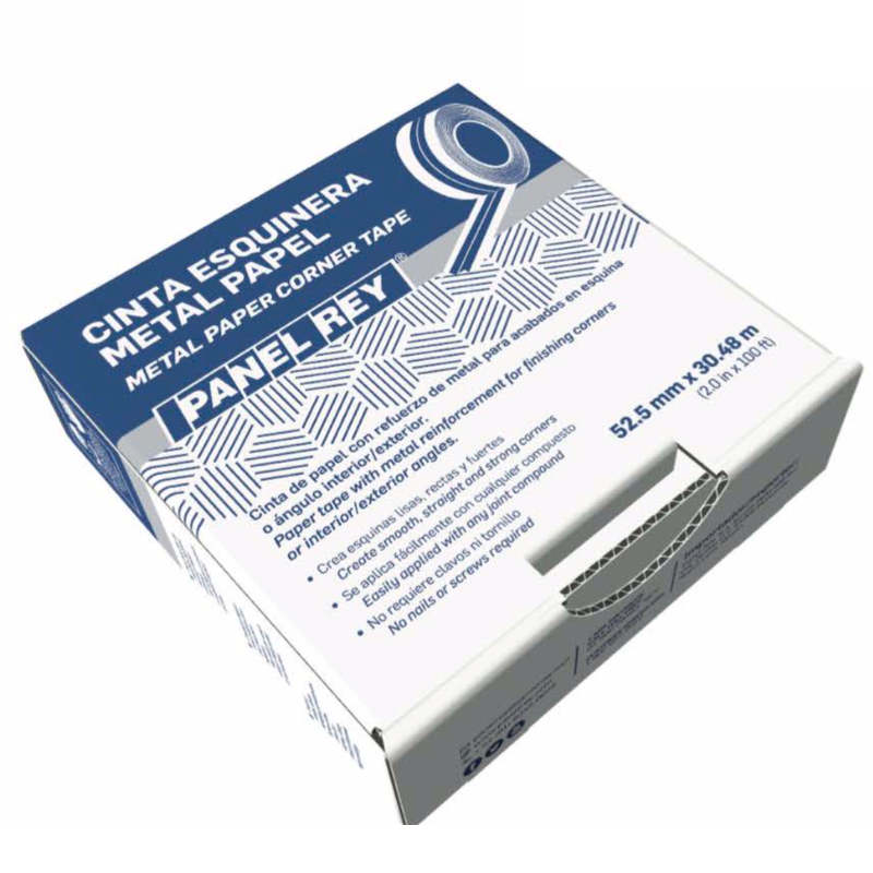 La Cinta Esquinera Metal Papel Marca Panel Rey con medidas 52.5 mm x 30.48 m es ideal para dar acabados y proteger las esquinas o ángulo interior/exterior formados por la unión de 2 paneles de yeso en trabajos interiores.