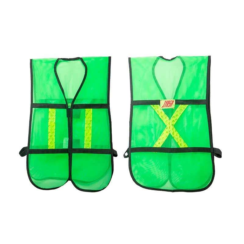 Chaleco verde fabricado en malla de punto abierto, con recubrimiento plástico y con un reflejante térmico 100% PVC color amarillo de 1 3/8" con microesferas encapsuladas, resistente a los cambios de temperatura, los rayos UV y al rasgado. Cuenta con una "X" en la espalda para identificar a un trabajador caído. También te permite identificar en zona obscuras si el trabajador está de frente o de espalda.