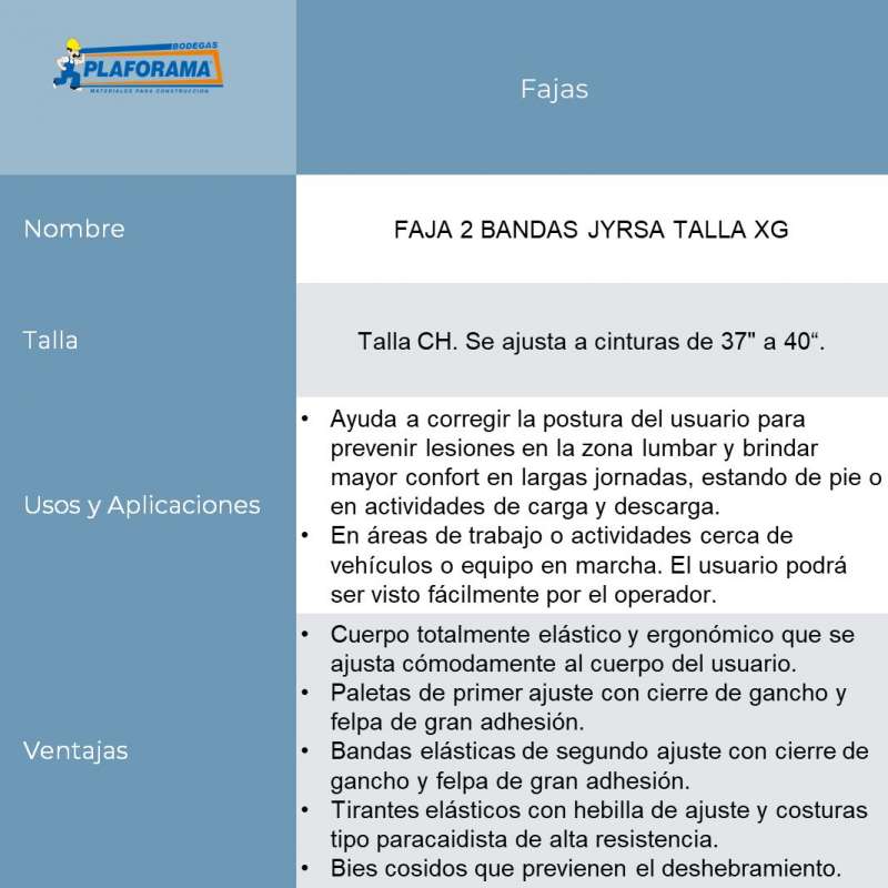 Faja sacrolumbar de malla con banda doble y tercer cintur贸n, talla CH. Se ajusta a cinturas de 37" a 40". Ayuda a corregir la postura del usuario para prevenir lesiones en la zona lumbar y brindar mayor confort en largas jornadas, estando de pie o en actividades de carga y descarga.