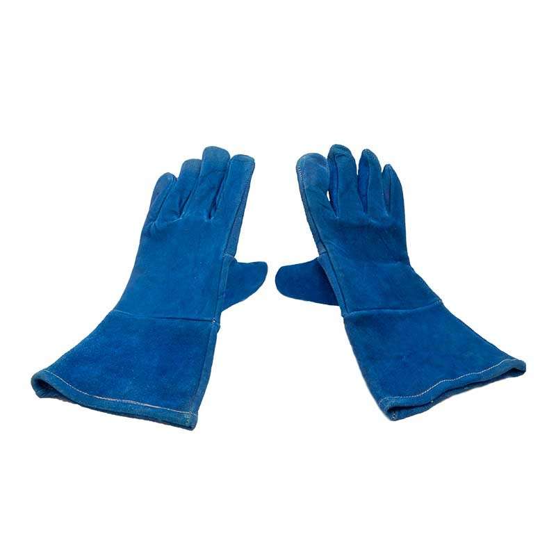 Par de guantes de soldador color azul hechos de carnaza con forro de algodón. Ofrece una capa protectora contra superficies calientes moderadas, ideal para trabajos de soldadura, abraión, corte y penetración