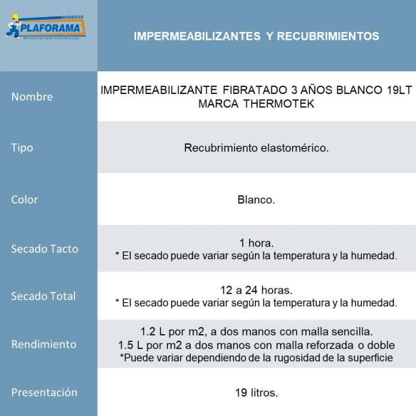 El impermeabilizante Thermotek 3 años Fibratado en cubeta de 19 L color blanco, es un eficaz recubrimiento impermeable y térmico en techos de concreto, asbesto-cemento, entre otros. En casas habitación, hoteles, fábricas, bodegas, etc. Es útil también para mantener y renovar sistemas impermeables ya existentes bien adheridos.