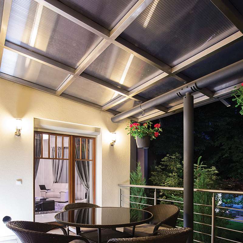 La placa de policarbonato tiene propiedades de aislamiento tĂ©rmico y acĂșstico. Ofrece protecciĂłn contra los rayos UV y maximiza la entrada de luz natural, lo cual contribuye al ahorro de energĂa.