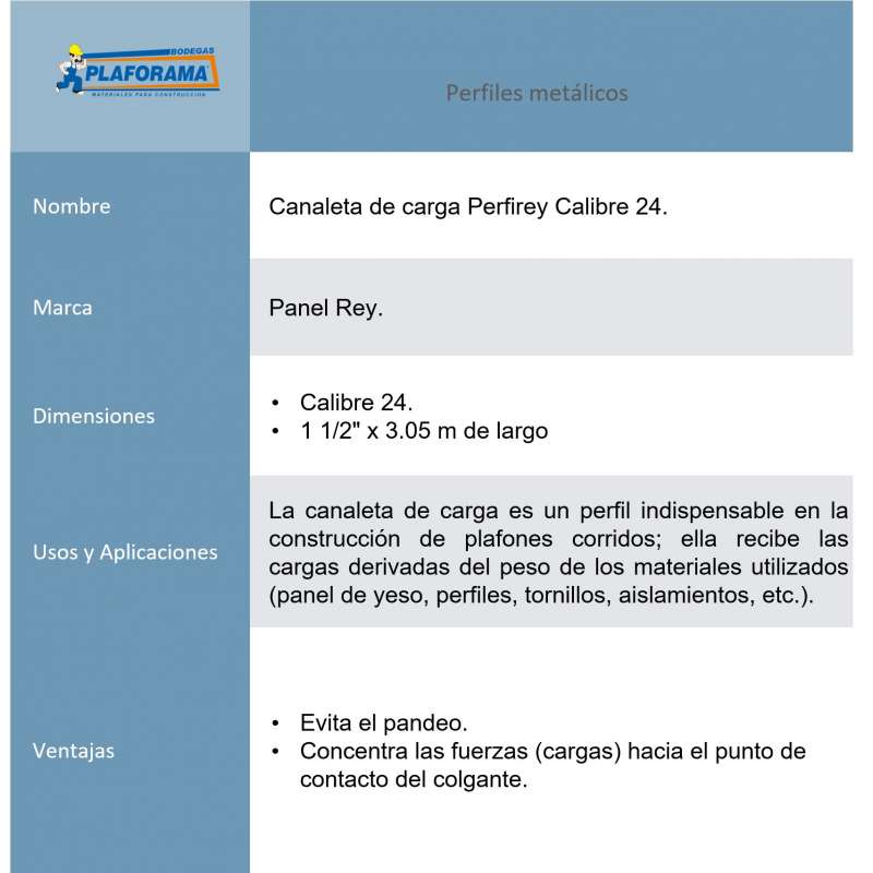 La Canaleta de Carga Perfirey Calibre 24 con medidas de 1 1/2 pulgadas de ancho x 3.05 m de largo, est谩 dise帽ada para soportar la suspensi贸n del plaf贸n corrido como anclaje a entrepisos en proyectos de construcci贸n ligera.