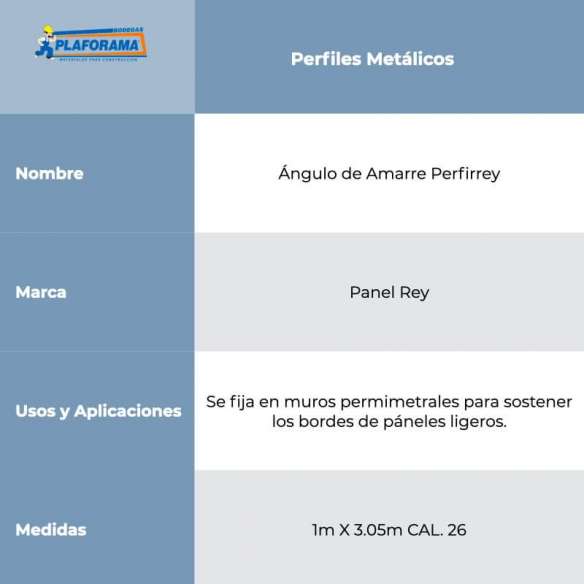 El Ángulo de Amarre Perfirey Calibre 26 con medidas de 2.5 cm de ancho x 3.05 m de largo, está diseñado para proteger, perfilar y fijar de manera sólida las esquinas en construcciones con paneles de yeso.